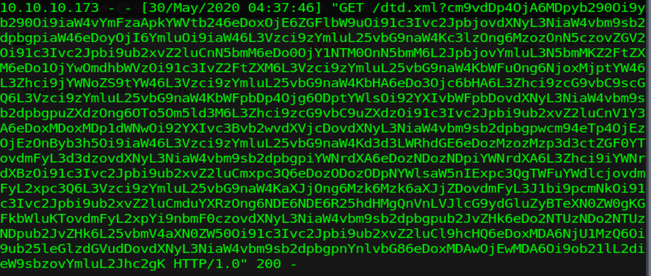 We got a hit on our python server from the target server looking for the dtd.xml file and we can see a 200 OK besides the request.